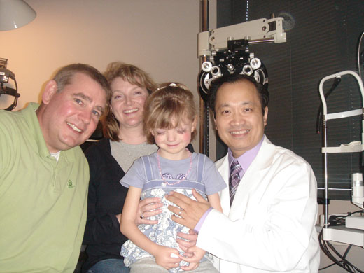 Desperate, Lisa and Jeff sought the assistance and recommendations of many doctors and medical centers, and finally they were led to contact Wang Foundation for Sight Restoration. Dr. Wang has been at the forefront of research and development of innovative corneal surgeries and holds several US patents for inventions of new biotechnologies to restore sight. After a careful examination of Anna’s eyes, Dr. Wang concluded that a new laser procedure could possibly restore Anna’s sight. With the help of a fellow board member of Wang Foundation for Sight Restoration, Dr. Dave Snodgrass, who helped sedate Anna, Dr. Wang successfully performed the laser eye procedure which removed the opacities blocking Anna’s sight line.